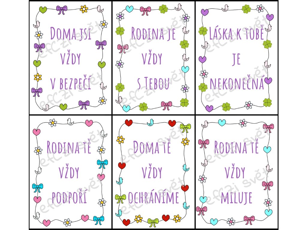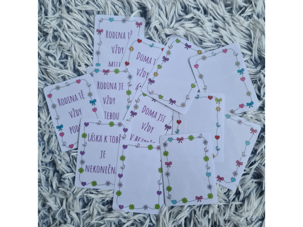 A pokud se Vám nelíbí předpřipravený vzkaz na kartičkách, tak si můžete objednat PDF verzi, kde obdržíte celkem 12 ks kartiček (6 kartiček se vzkazy a 6 kartiček se stejnými obrázky, ale bez textů, takže si můžete napsat na kartičky jakýkoliv svůj osobní vzkaz dítěti ;-).