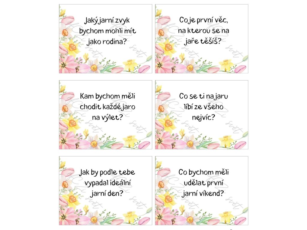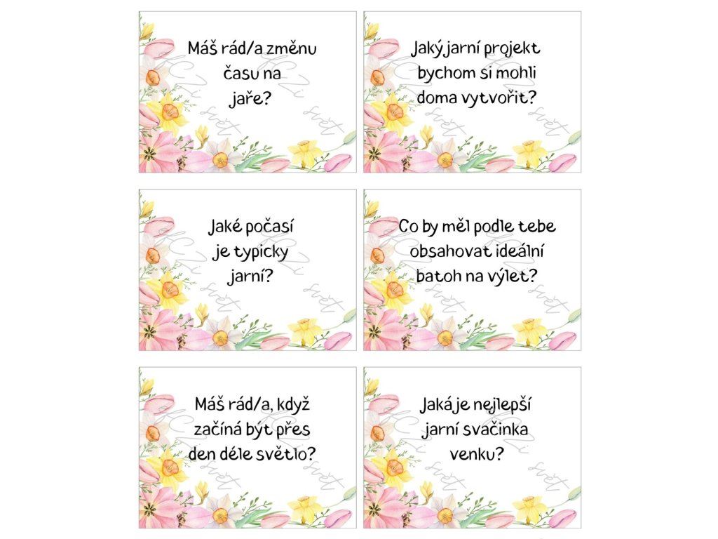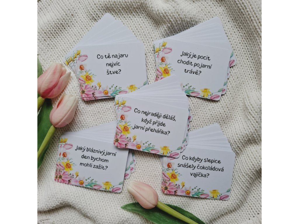 Jaro je obdobím nových začátků, barev, lehkosti a společných zážitků. Tyhle konverzační kartičky pomohou proměnit obyčejné chvíle v hlubší rozhovory, smích i sdílení. Stačí vytáhnout jednu kartičku a nechat se překvapit, kam vás otázka zavede.