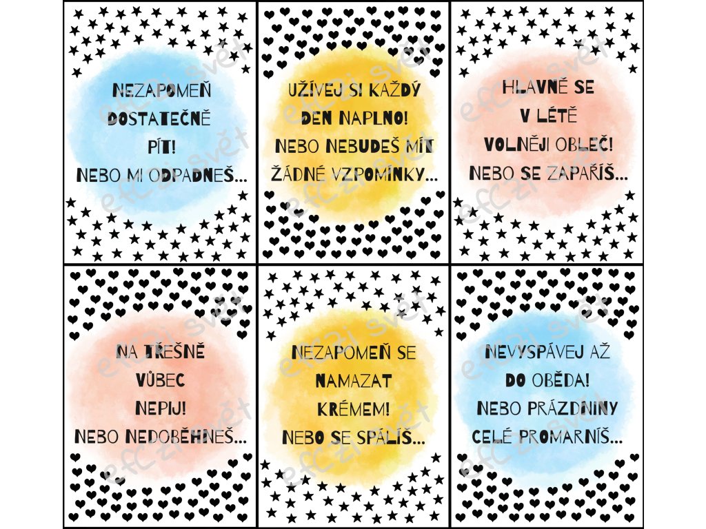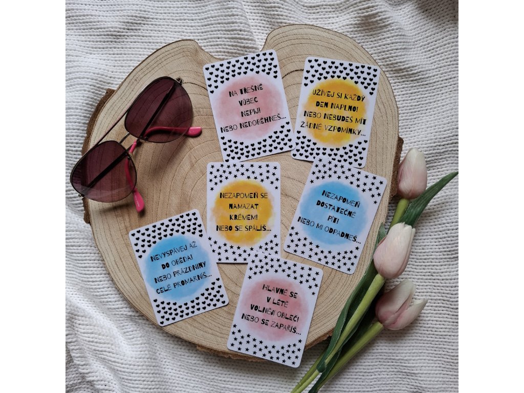 Léto je v plném proudu, slunce pálí a prázdniny jsou v plném rozpuku. Děti si užívají volných dní, skáčou do bazénu, běhají po loukách, lezou po stromech a dopřávají si hromady zmrzliny. Všichni víme, že léto má svá specifika; horko nás nutí měnit rytmus, pít víc vody, nezapomínat na opalovací krém a občas si dát pauzu ve stínu. Děti na to ale často zapomínají v zápalu hry. A právě tehdy může přijít vhod jemné připomenutí – zábavné, barevné, nenásilné. Naše kartičky vdechnou létu prázdninovou náladu a připomenou dětem, že na ně myslíme (i když zrovna nejsme doma) a zároveň jim připomenou důležité letní návyky, aniž by působily poučkovitě.