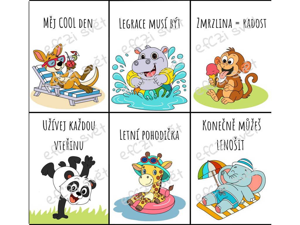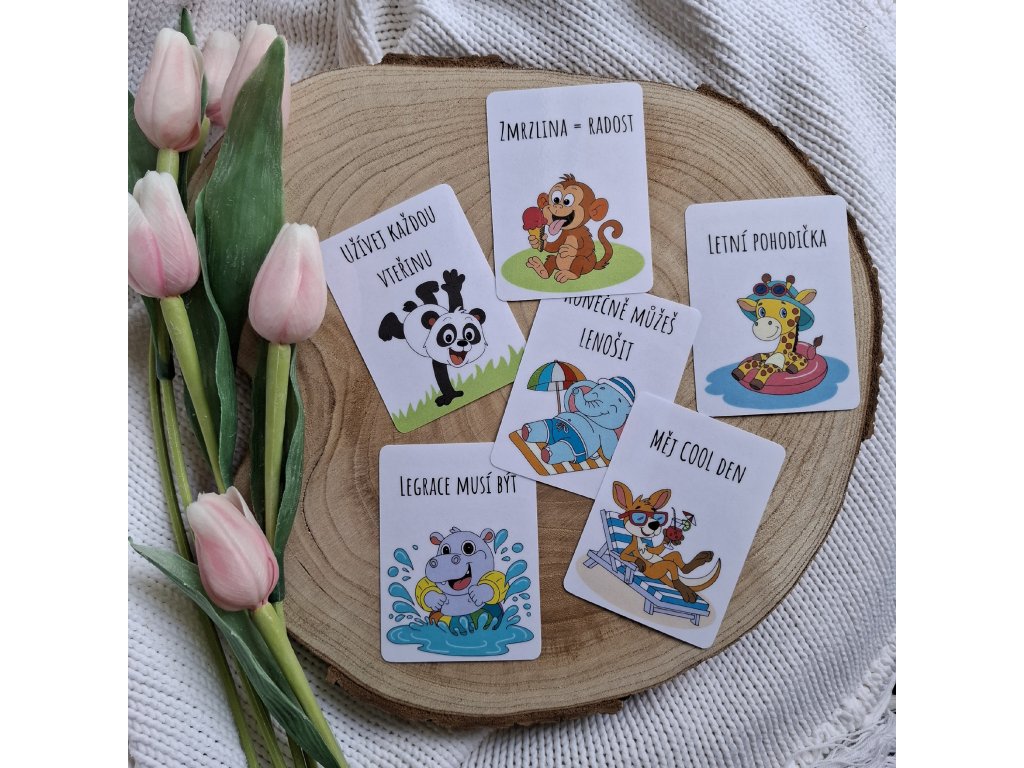 Léto je v plném proudu, teploměr se potí stejně jako medvěd v kožichu a zvířátka ze zoo si řekla, že je čas dát si oraz. A hádejte co? Vzaly si dovolenou – rovnou na našich kartičkách. Máme tu opici se zmrzlinou, hrocha, který se cachtá s rukávky ve vodě, klokana na lehátku s drinkem v ruce, skákající pandu, opalujícího se slona a žirafu na nafukovacím lehátku. To je prostě pohoda. Každá kartička navodí tu správnou letní atmosféru. Ať už balíte svačinu na tábor, na výlet nebo jen na přežití horkého dne, tahle parta ze zoo dětem jistě zvedne náladu.