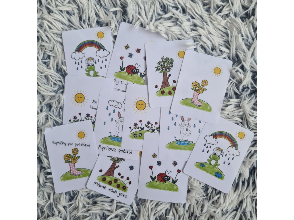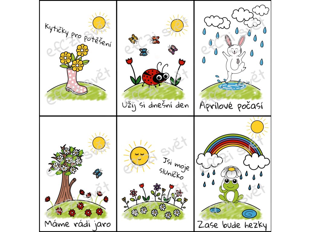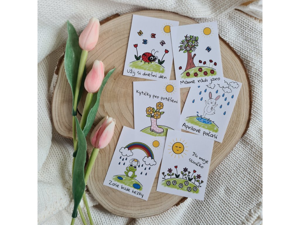 - PDF varianta: 12 ks kartiček (6 kartiček s obrázky a texty + 6 kartiček s obrázky bez textů, na které si můžete napsat vlastní vzkaz)