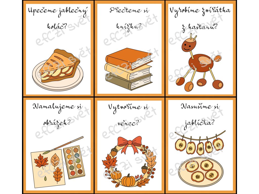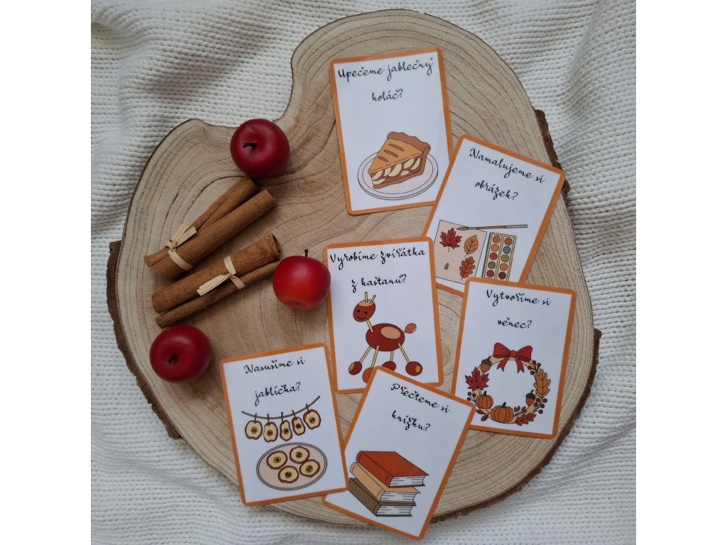 Podzim je kouzelné období, které si zaslouží naši plnou pozornost. Barevné listí šustící pod nohama, chladnější rána, vůně jablek, skořice a pečené dýně ve vzduchu. Je to čas, kdy se příroda připravuje na odpočinek a kdy i my zpomalujeme, balíme se do teplých šál a hledáme radosti v maličkostech. A právě proto vznikly naše podzimní kartičky se zážitkovými úkoly – abyste si tento čas skutečně užili. Každá kartička je malým podnětem, jak proměnit obyčejné dny v neobyčejné chvíle. Tyto drobné úkoly podporují společné zážitky, kreativitu i hravost. Zážitky jsou tím, co si uchováme nejdéle. A podzim je jako stvořený k tomu, abychom si vytvořili nové vzpomínky. Nečekejte, až podzim uteče. Někdy máme plnou hlavu nápadů, co s dětmi podnikneme a pak ve shonu zjistíme, že podzim je pryč a my si ten podzimní čas společně moc neužili. S touto sadou vás čeká 6 tradičních podzimních úkolů, které si s vašimi dětmi určitě užijete.