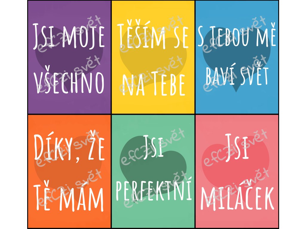 A pokud se Vám nelíbí předpřipravený vzkaz na kartičkách, tak si můžete objednat PDF verzi, kde obdržíte celkem 12 ks kartiček (6 kartiček se vzkazy a 6 kartiček se stejnými obrázky, ale bez textů, takže si můžete napsat na kartičky jakýkoliv svůj osobní vzkaz dítěti ;-).