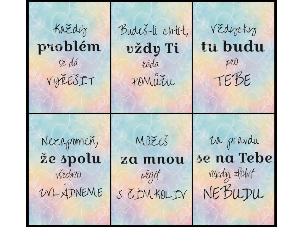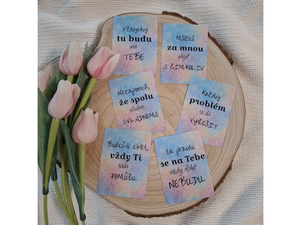 - 7 ks kartiček (6 kartiček s obrázky a texty + 1 kartička se stejným pozadím, ale bez textu, na kterou si můžete napsat vlastní vzkaz)
