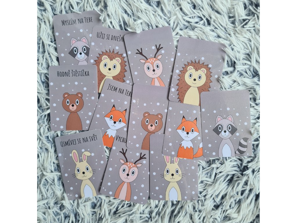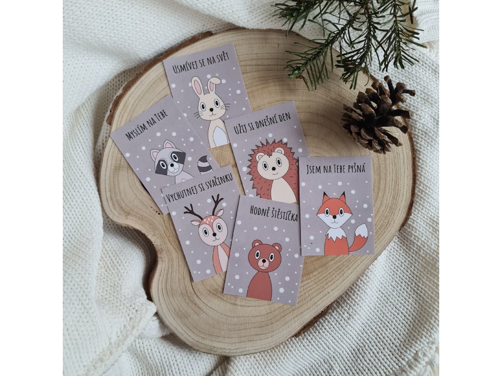 Zima přináší kouzlo zasněžených lesů, teplých šál a hřejivých chvil – a kdo by nechtěl poslat dětem do školy kousek této pohádkové atmosféry? Naše kartičky se vzkazy jsou plné roztomilých zvířátek, která mají jedno důležité poslání – vykouzlit úsměv na tváři vašich dětí. Králík, ježek, jelen, medvěd, mýval a liška – všichni tito lesní kamarádi přinášejí povzbuzení, milá slova a trochu zimní radosti do každé přestávky. Stačí jen vložit kartičku do batohu např. ke svačině a nechat zvířátka, aby dětem popřála krásný den, dodala odvahu nebo je jen rozveselila svým obrázkem. I v mrazivém počasí mohou tato zvířátka zahřát – úsměvem, láskou a radostí, kterou přinášejí. Proměňte školní den ve veselé zimní dobrodružství. Objednejte si své zimní kartičky se zvířátky a rozdávejte radost každý den.
